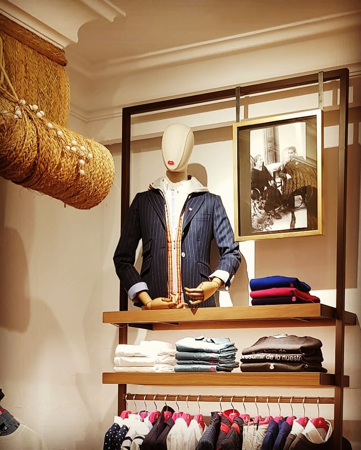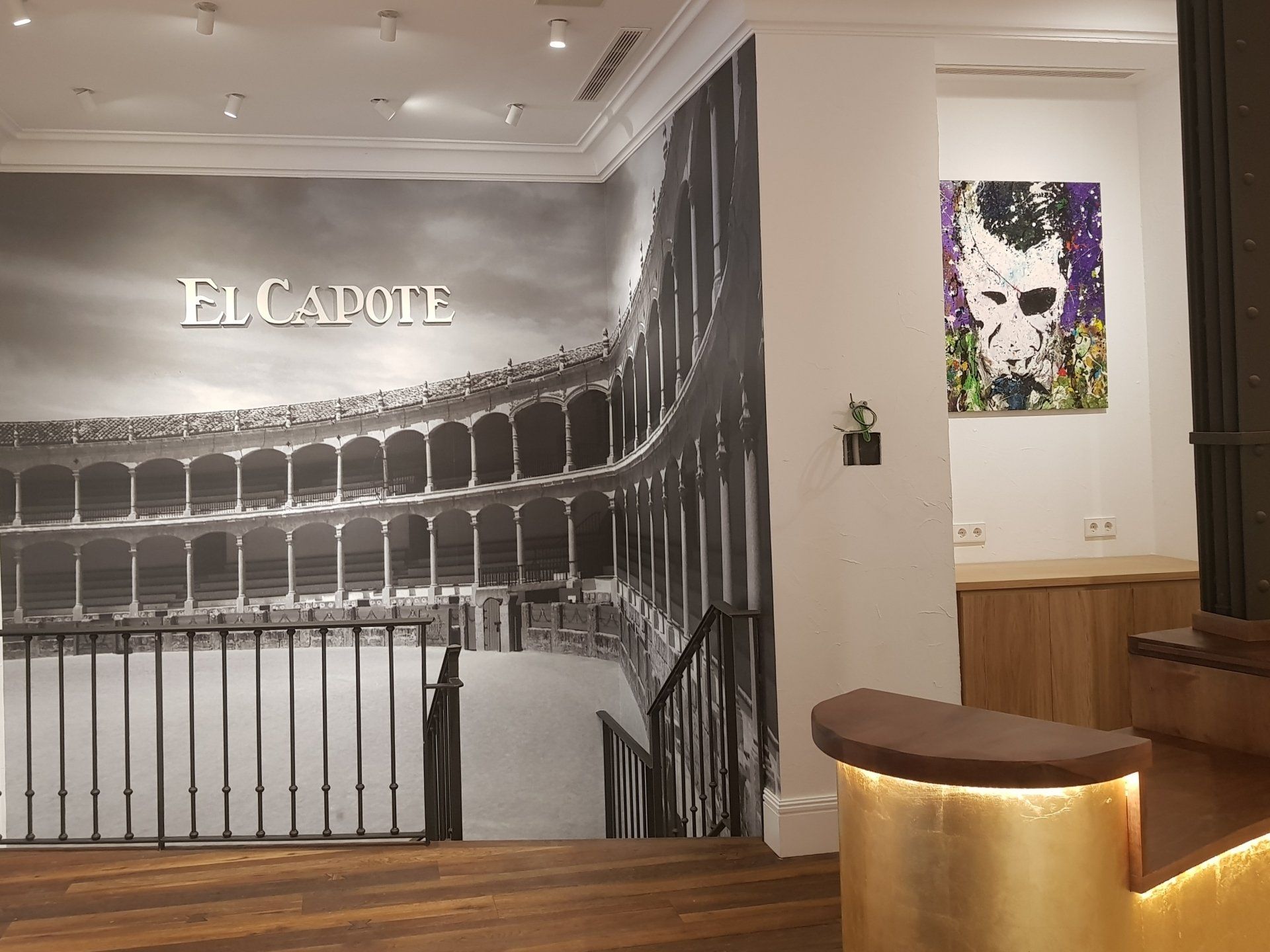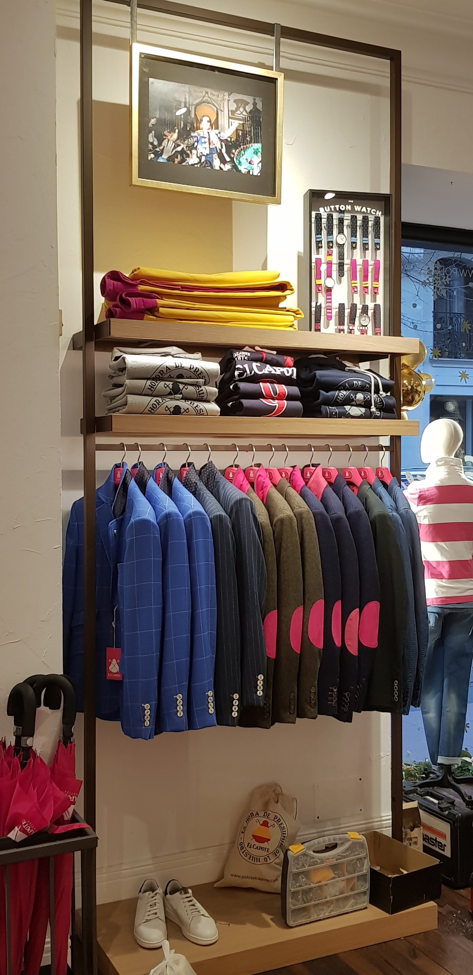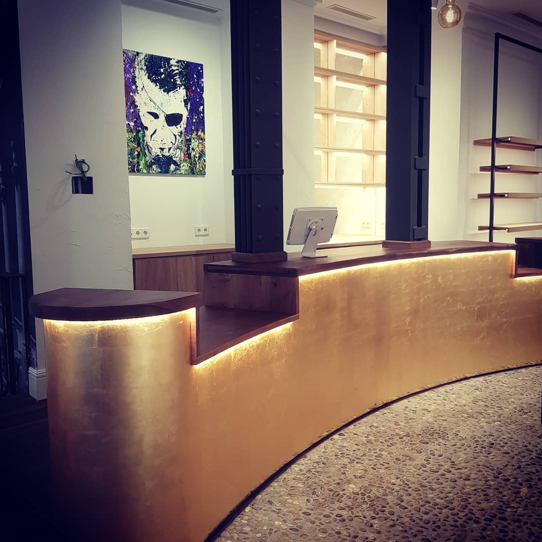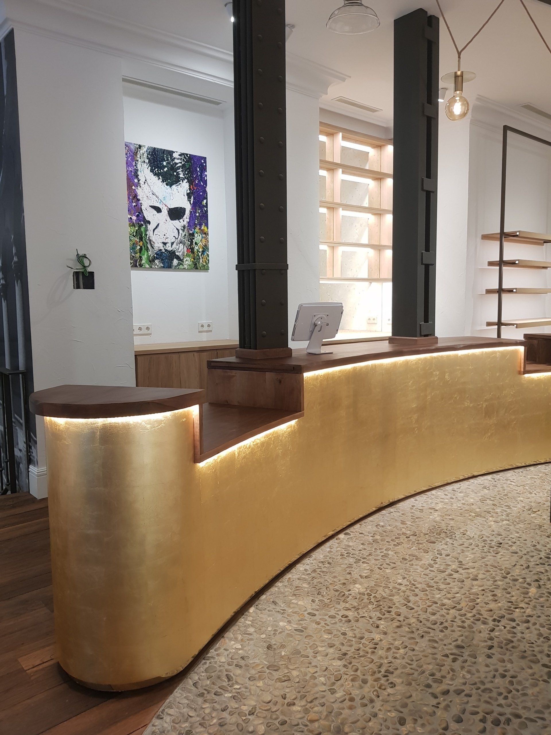 Trabajos realizados en la tienda El Capote. Fabricando mobiliario en general, como elemento a destacar el mostrador central forrado en pan de oro con tapa de nogal del país macizo, zona de vitrinas. Muebles d pared en roble barnizado con estructura de hierro lacado