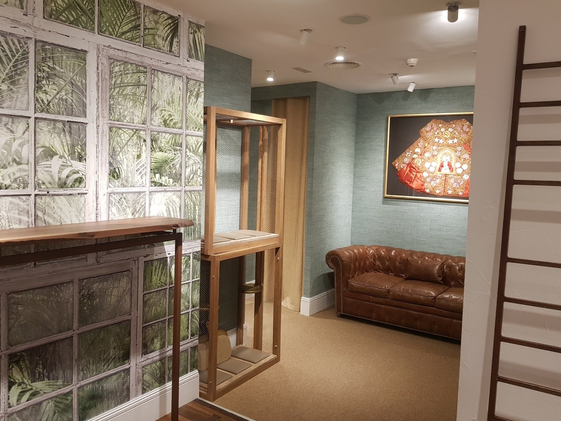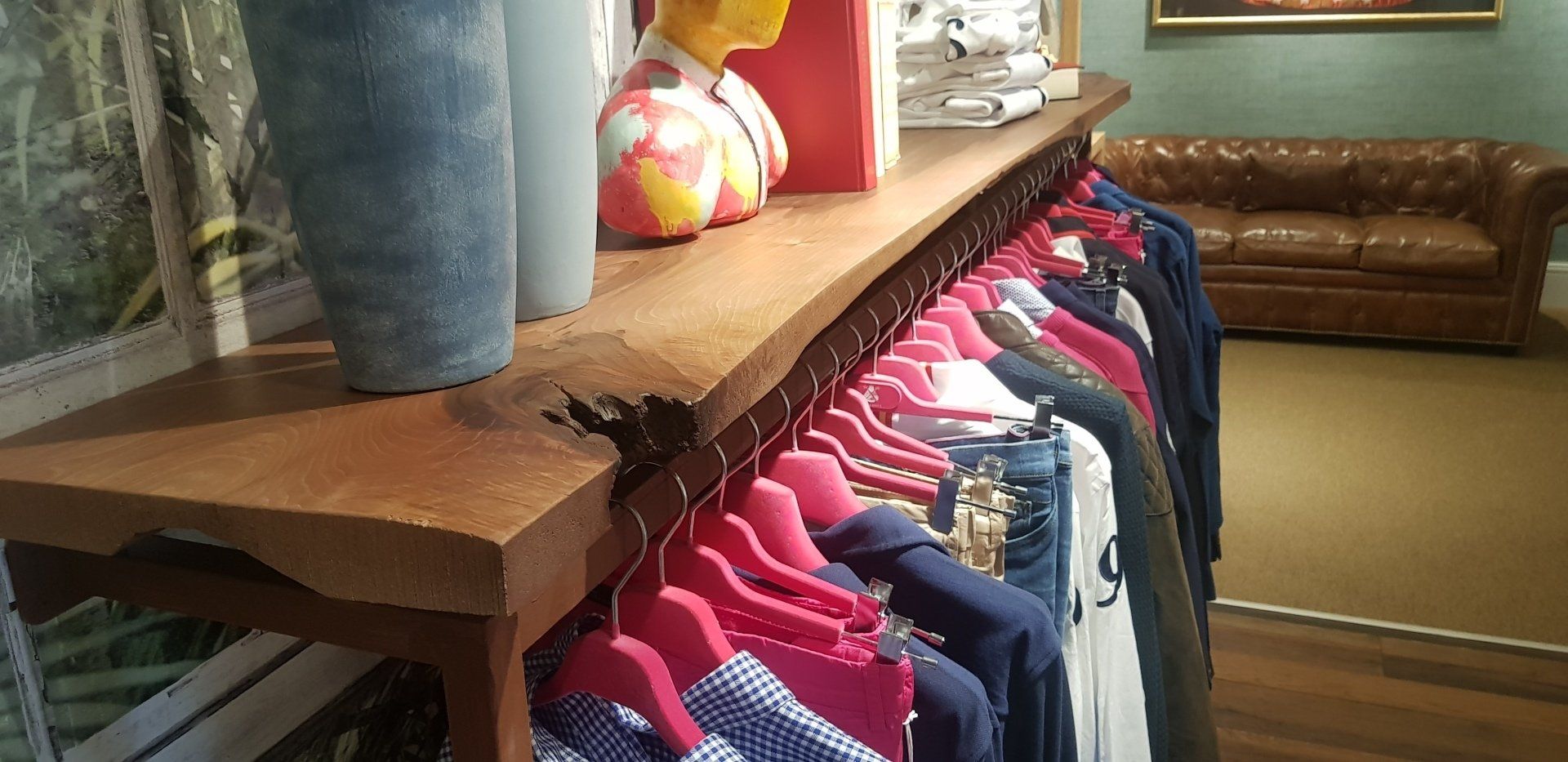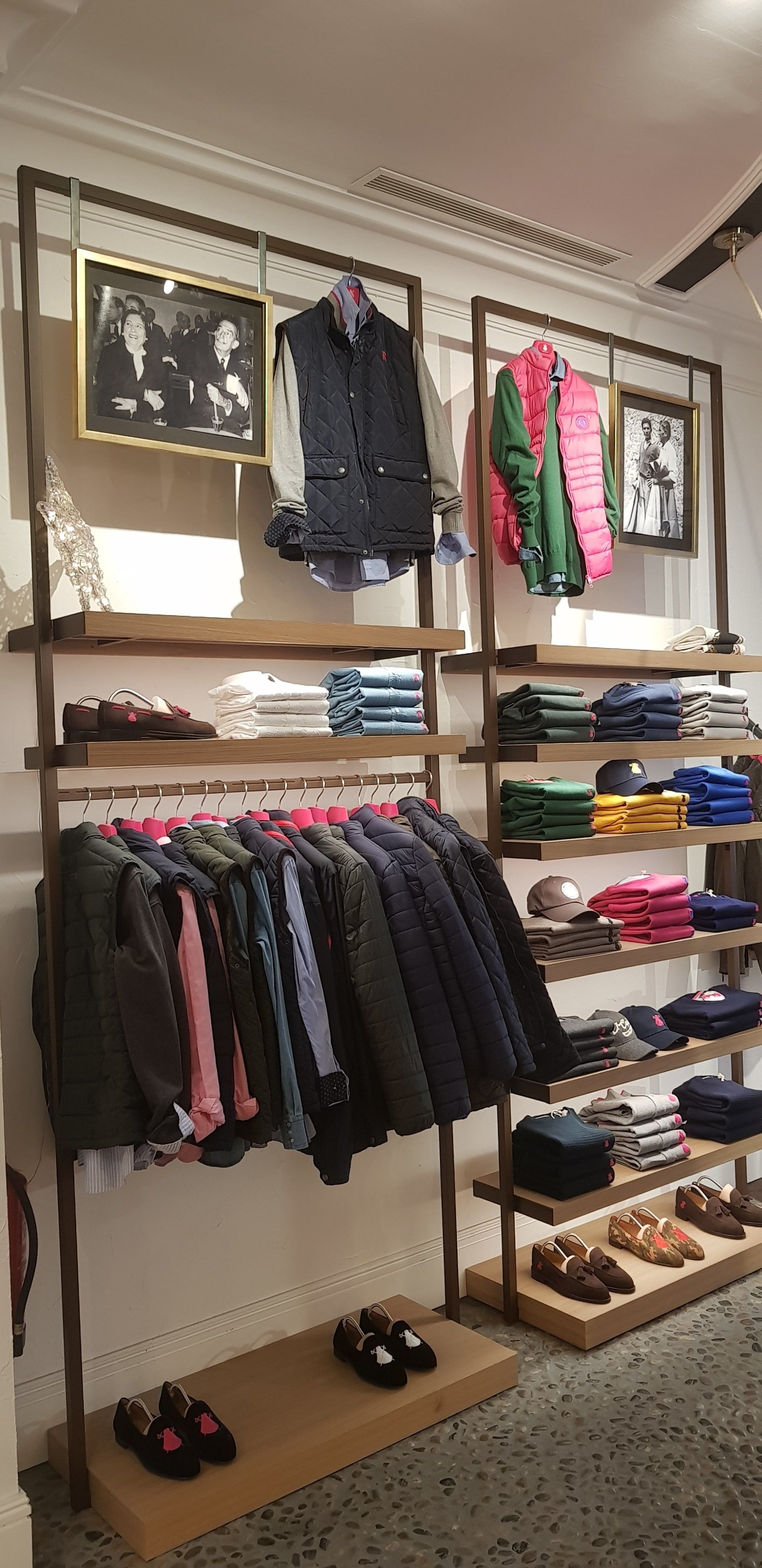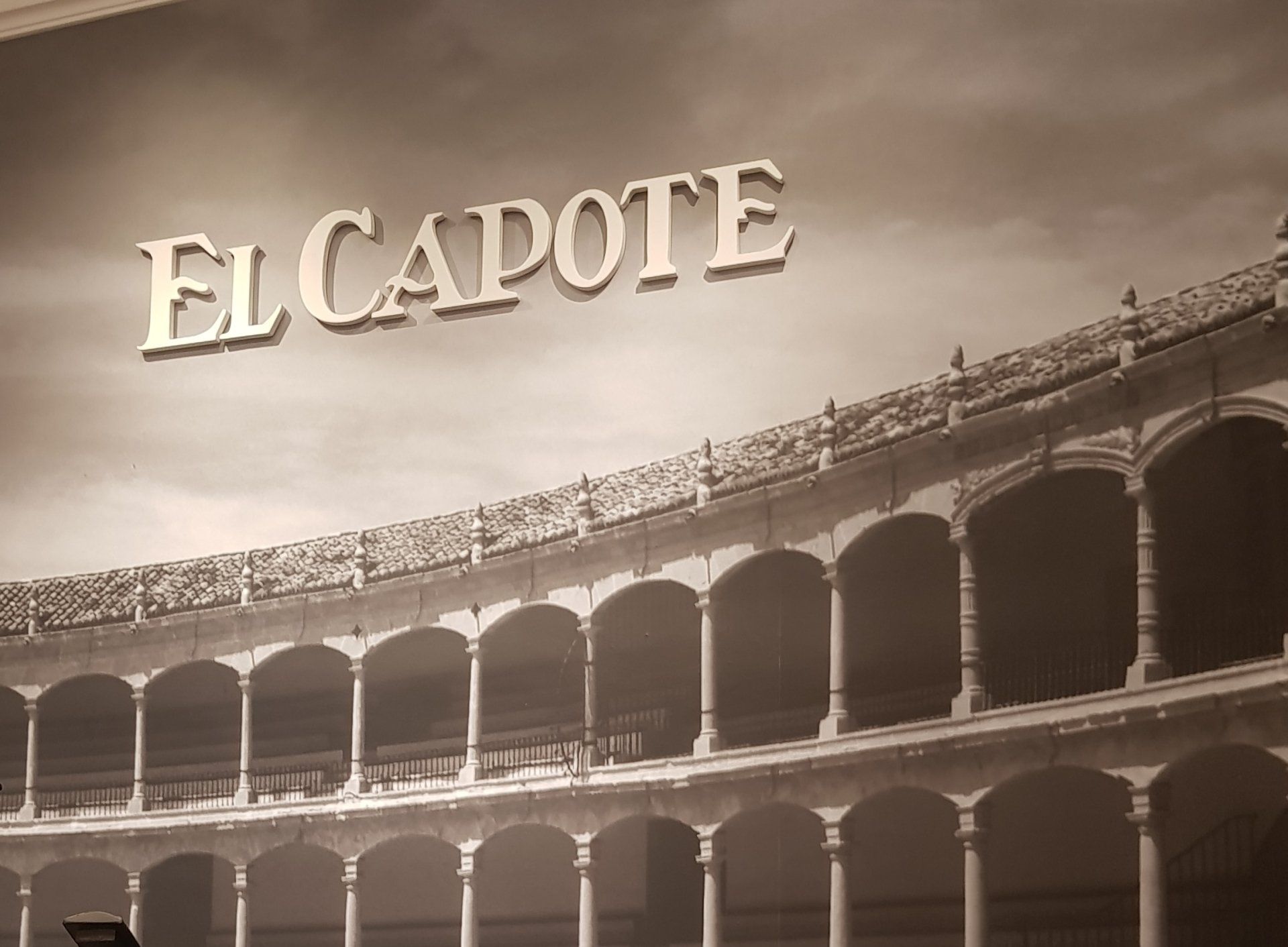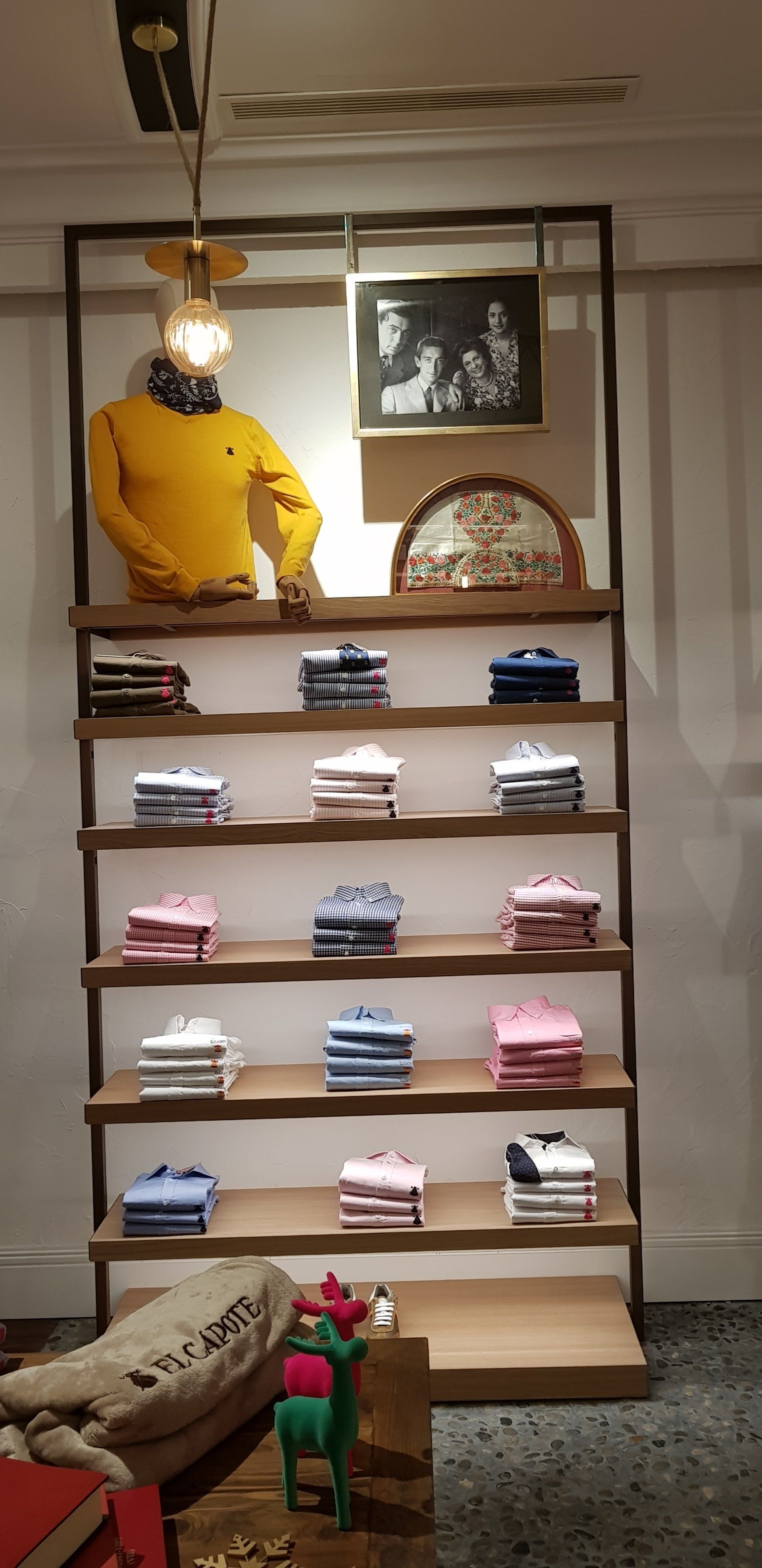 Trabajos realizados en la tienda El Capote. Fabricando mobiliario en general, como elemento a destacar el mostrador central forrado en pan de oro con tapa de nogal del país macizo, zona de vitrinas. Muebles d pared en roble barnizado con estructura de hierro lacado