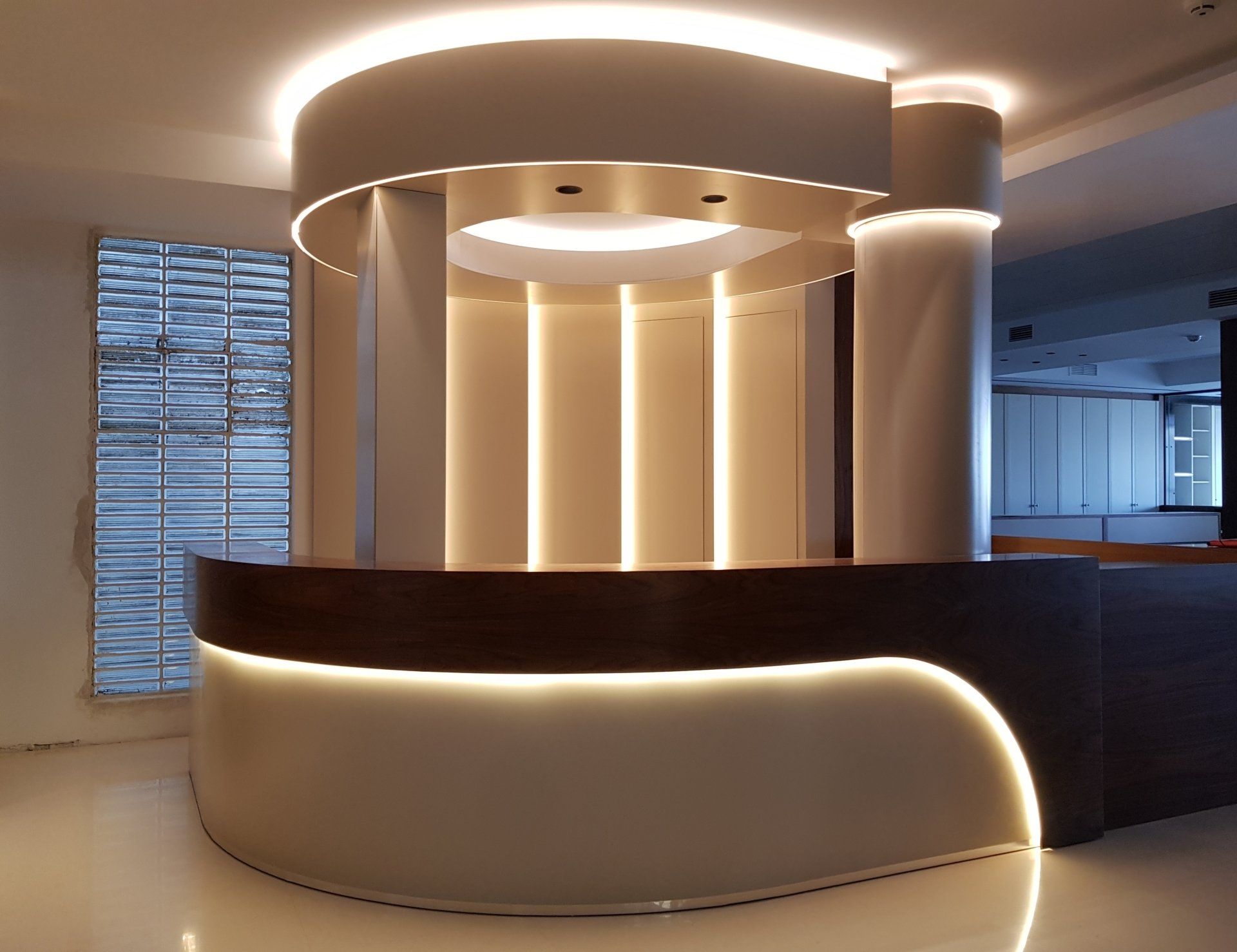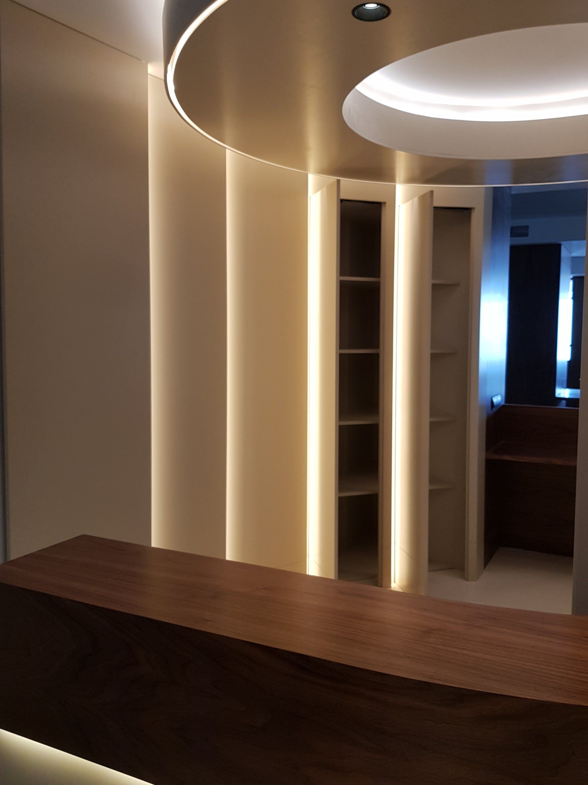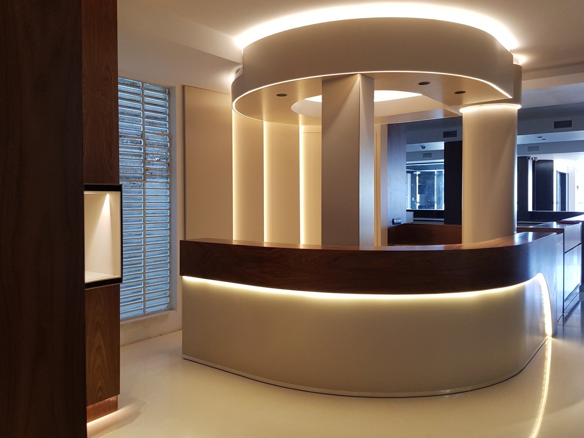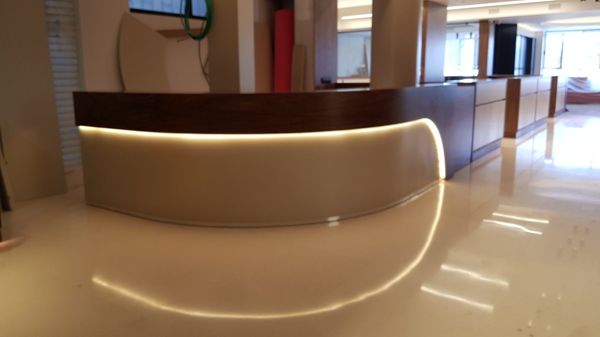 Trabajos realizados en oficinas centrales de Gilmar, fabricación de mostrador curvo en nogal americano y laca. Cornisa con la forma del logotipo con iluminación led perimetral. Empanelado de la trasera con paños móviles con iluminación led