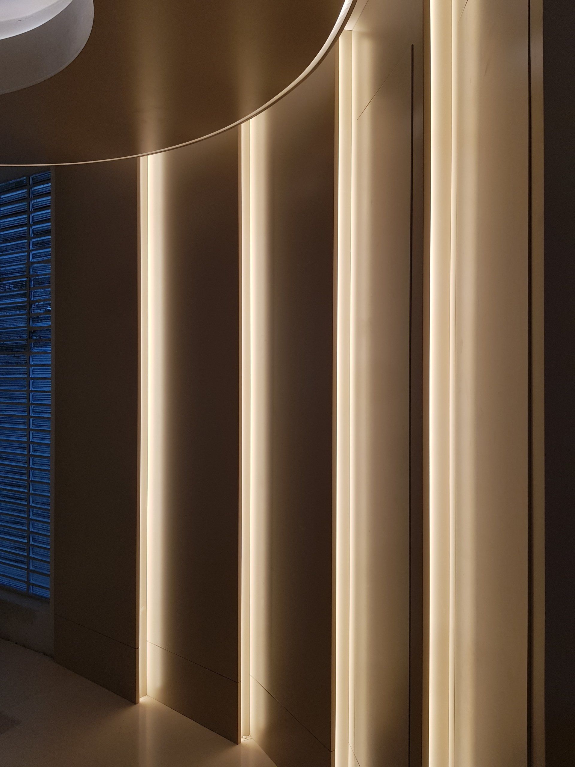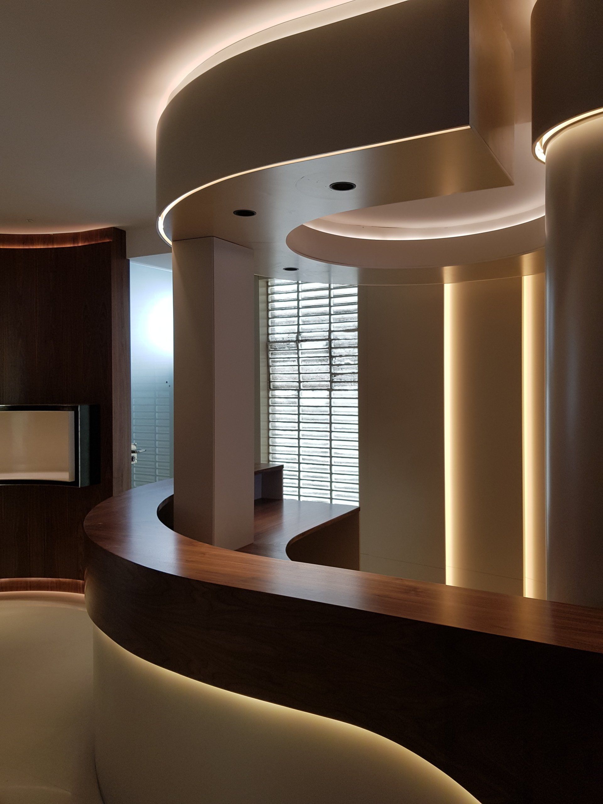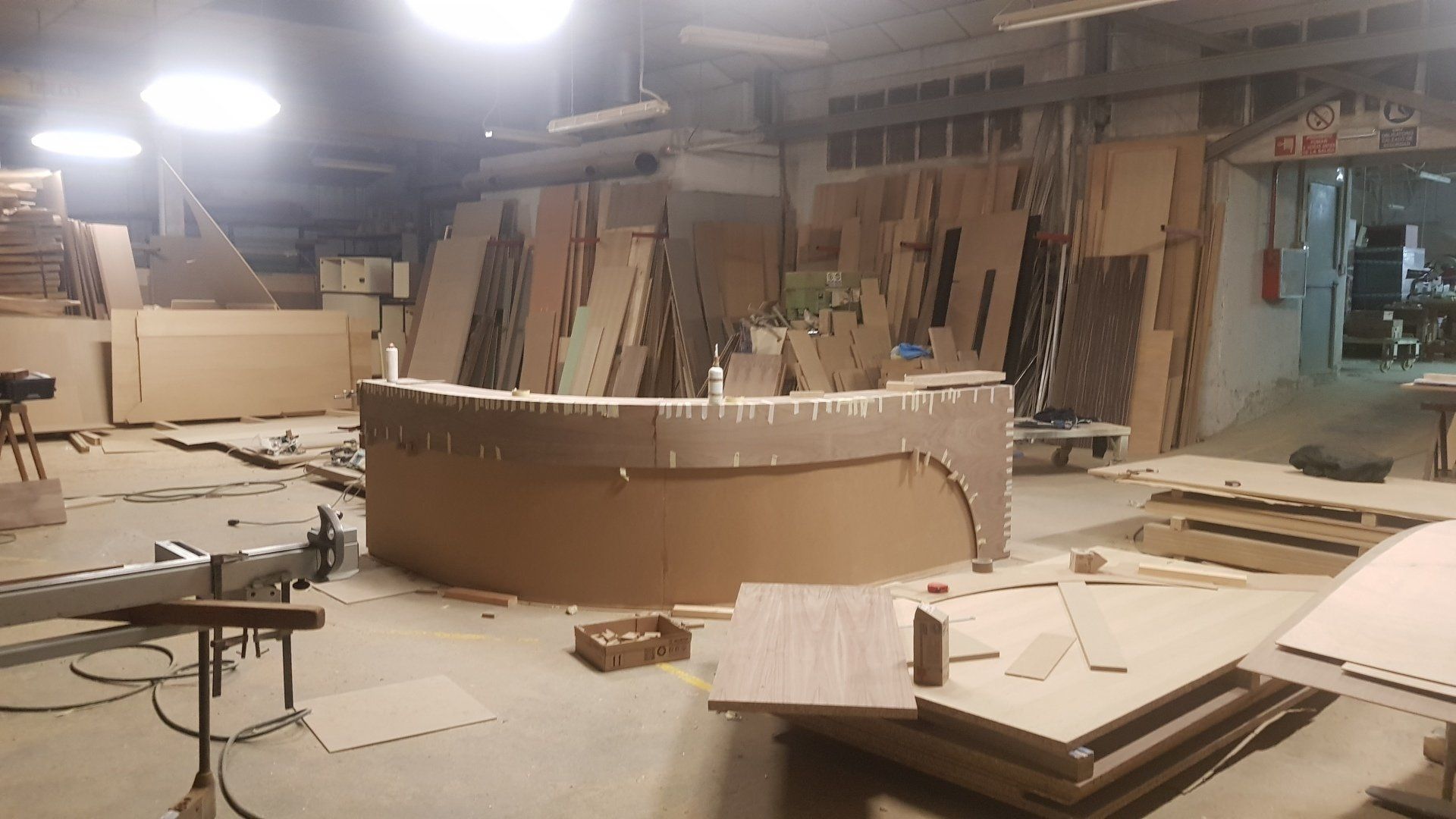 Trabajos realizados en oficinas centrales de Gilmar, fabricación de mostrador curvo en nogal americano y laca. Cornisa con la forma del logotipo con iluminación led perimetral. Empanelado de la trasera con paños móviles con iluminación led
