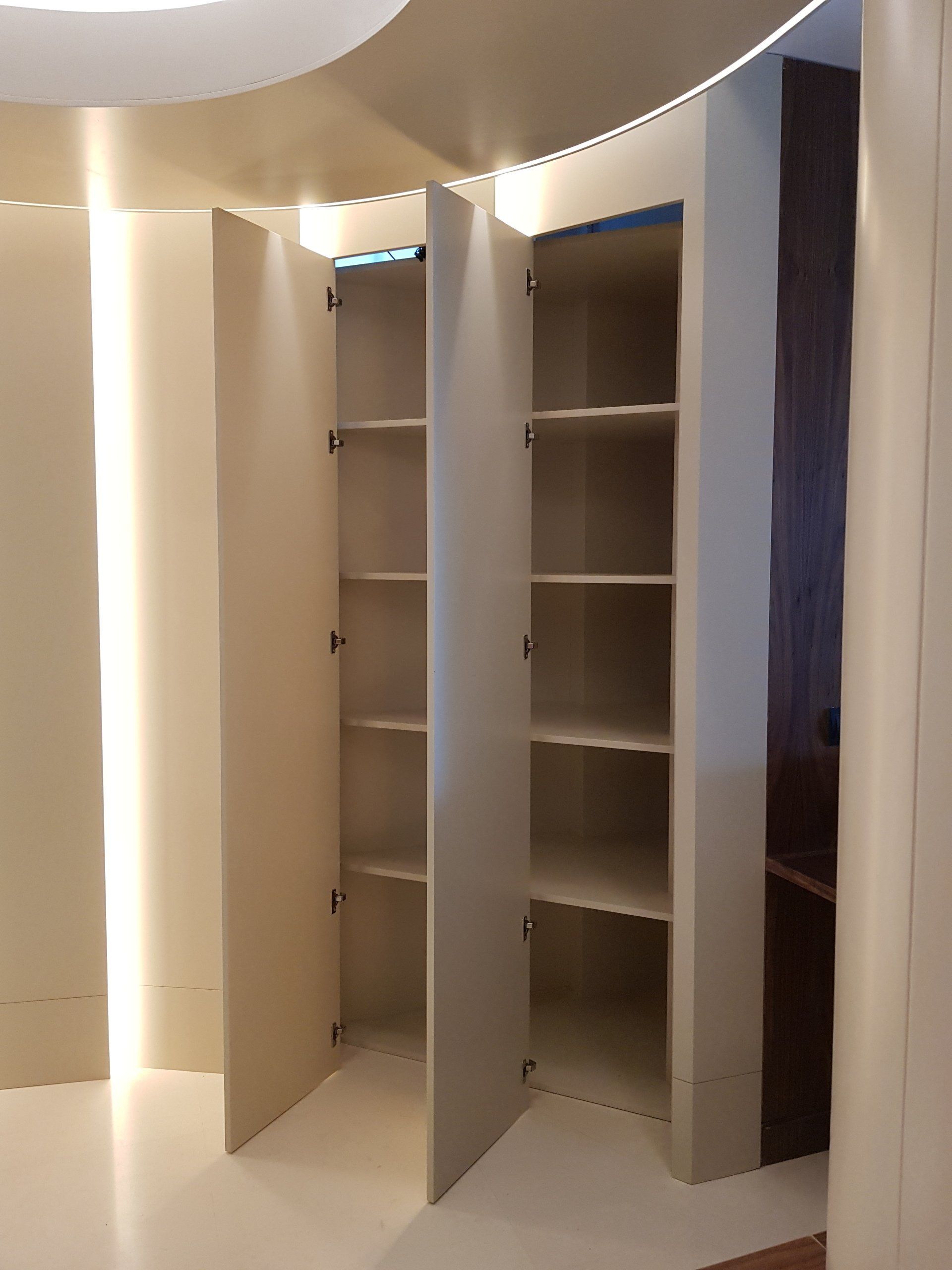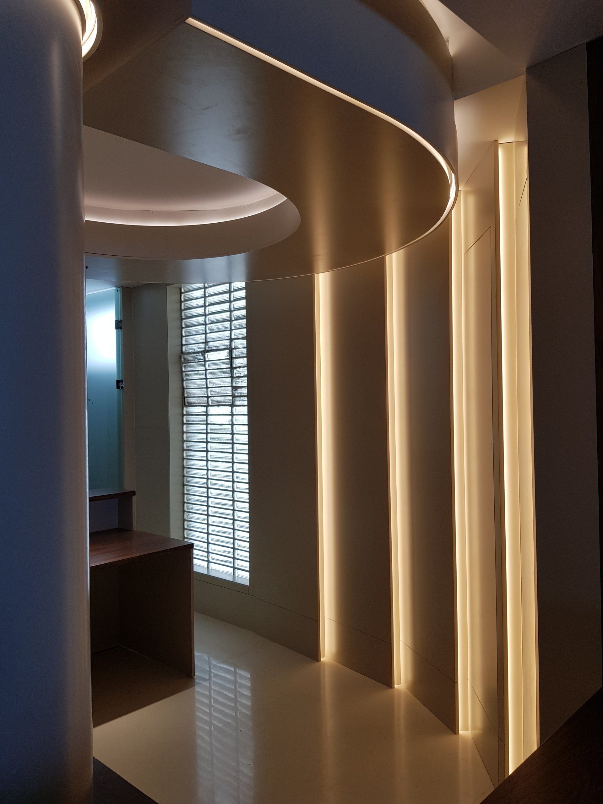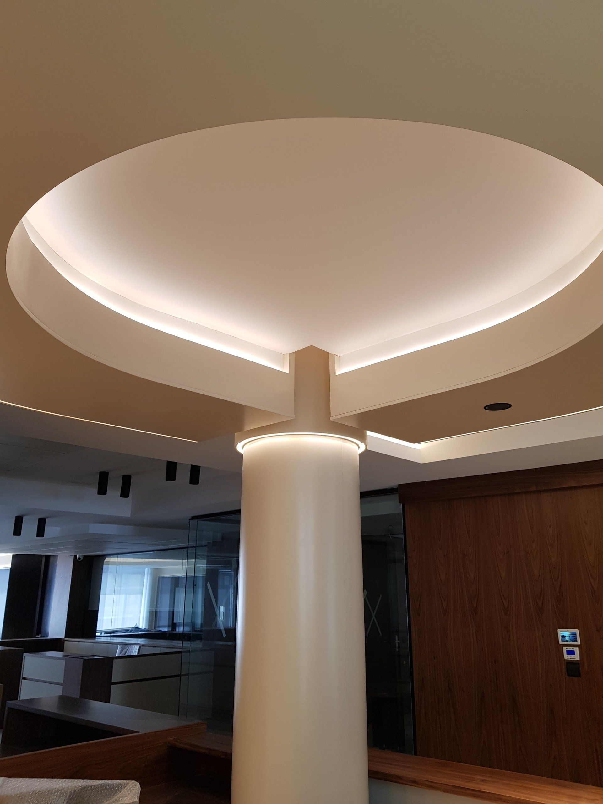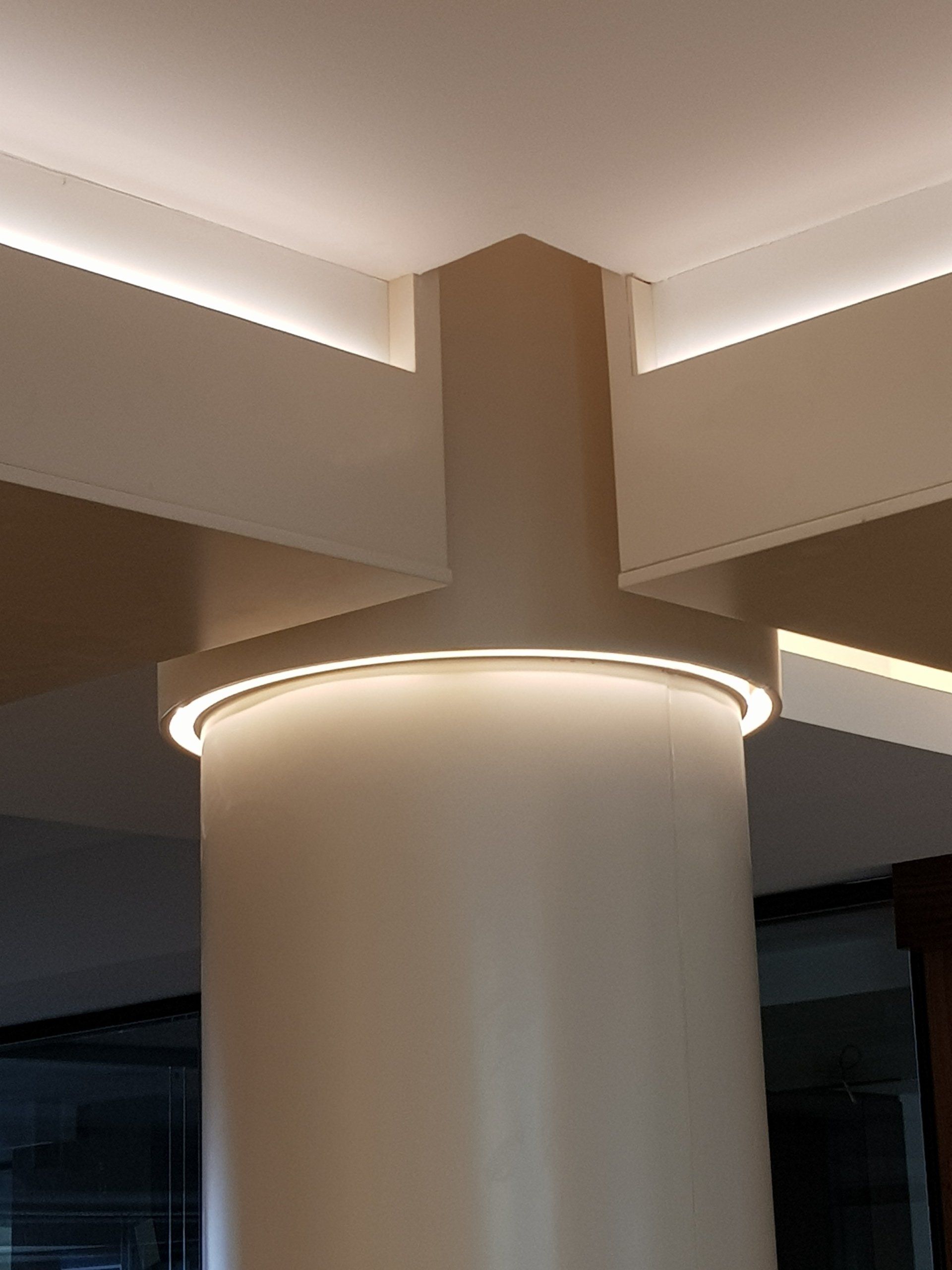 Trabajos realizados en oficinas centrales de Gilmar, fabricación de mostrador curvo en nogal americano y laca. Cornisa con la forma del logotipo con iluminación led perimetral. Empanelado de la trasera con paños móviles con iluminación led