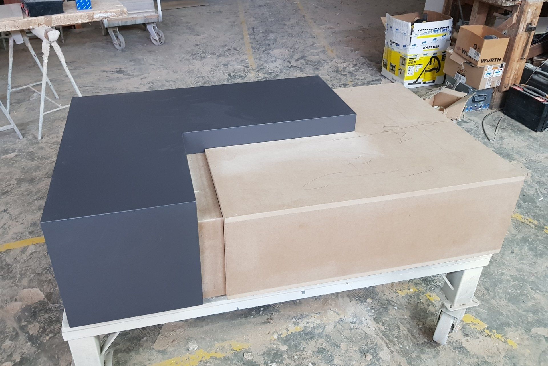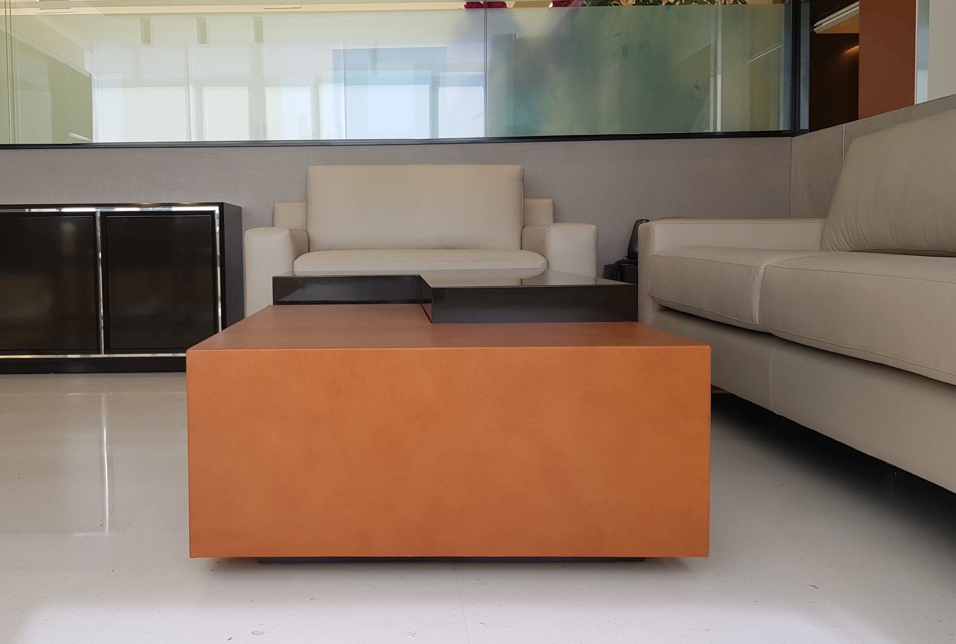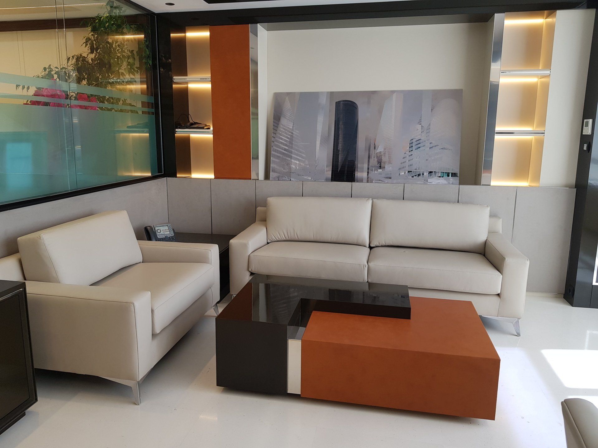 Estantería en dm lacado, con entrecalles de acero, puertas empapeladas. Mesa fabricada en dm lacado brillo, con un modulo de cuero y entrecalle en acero.