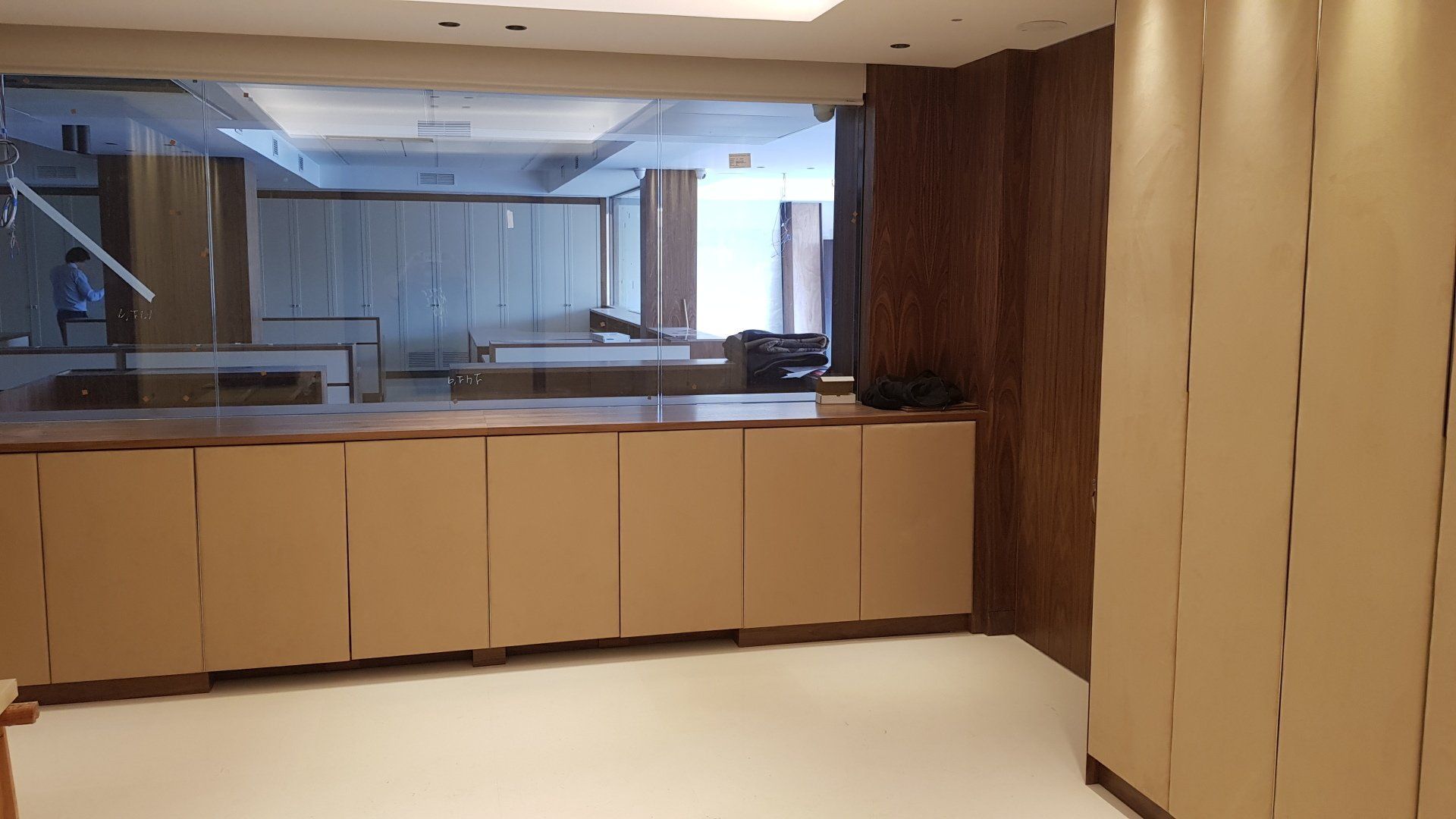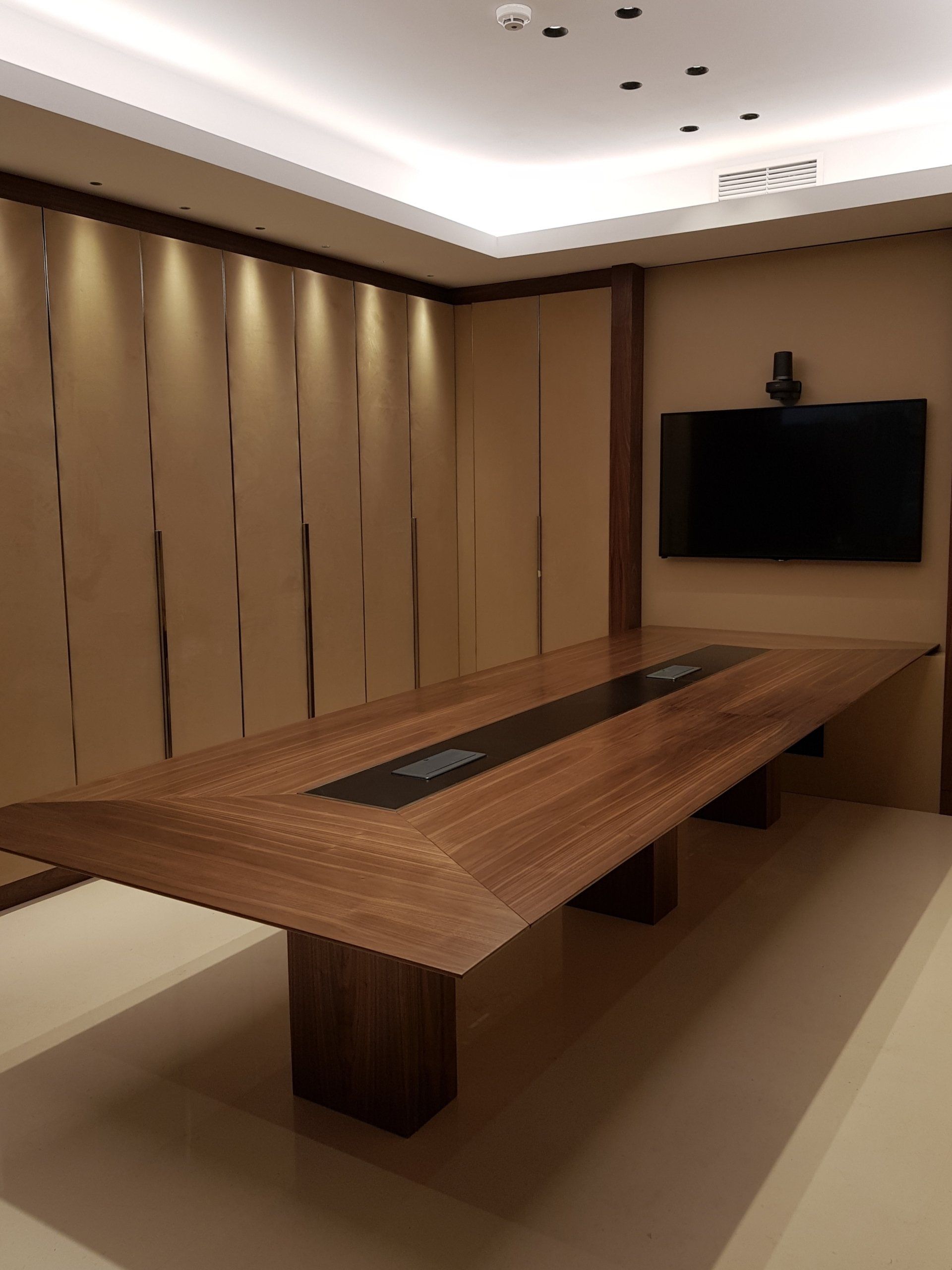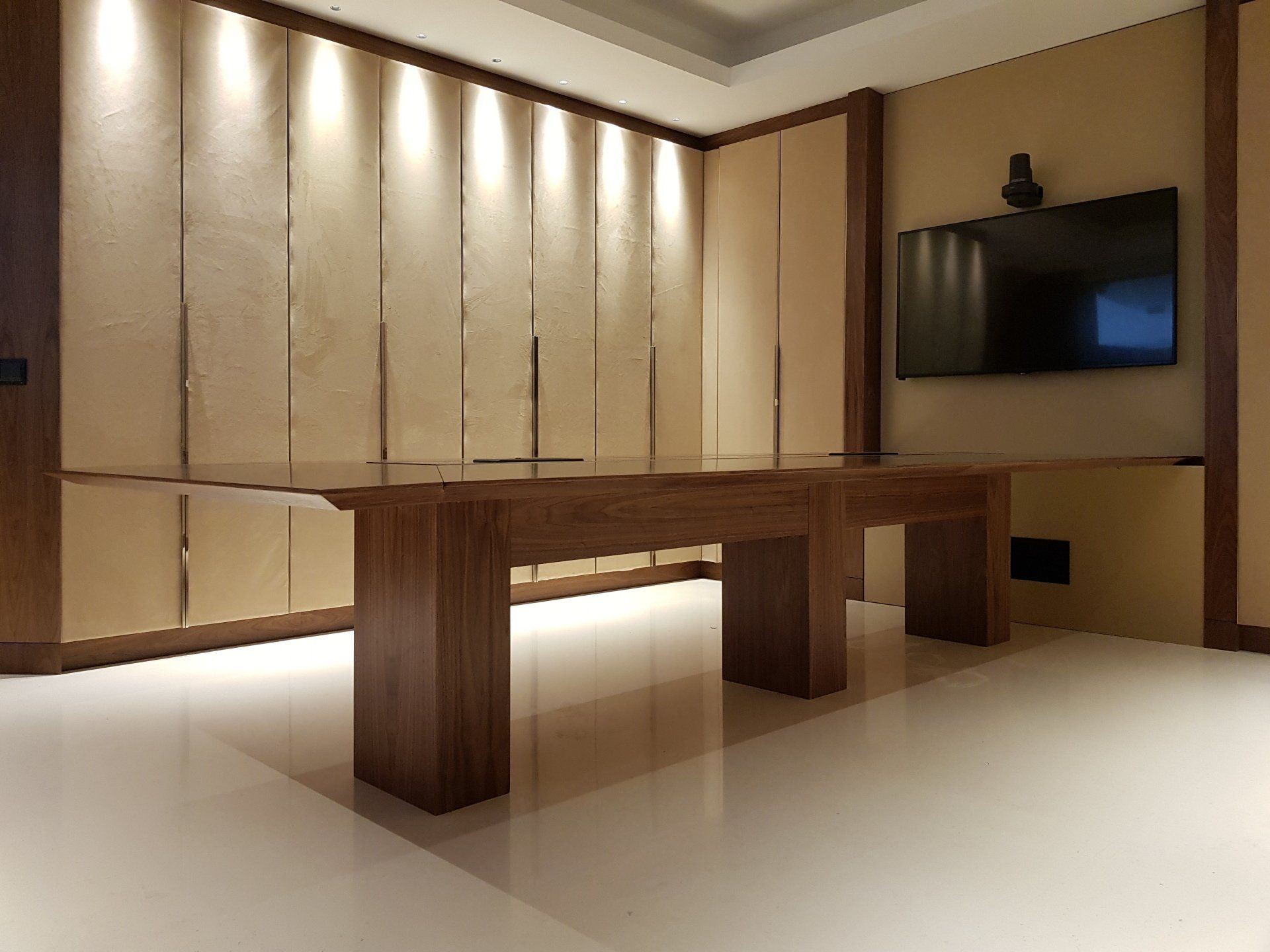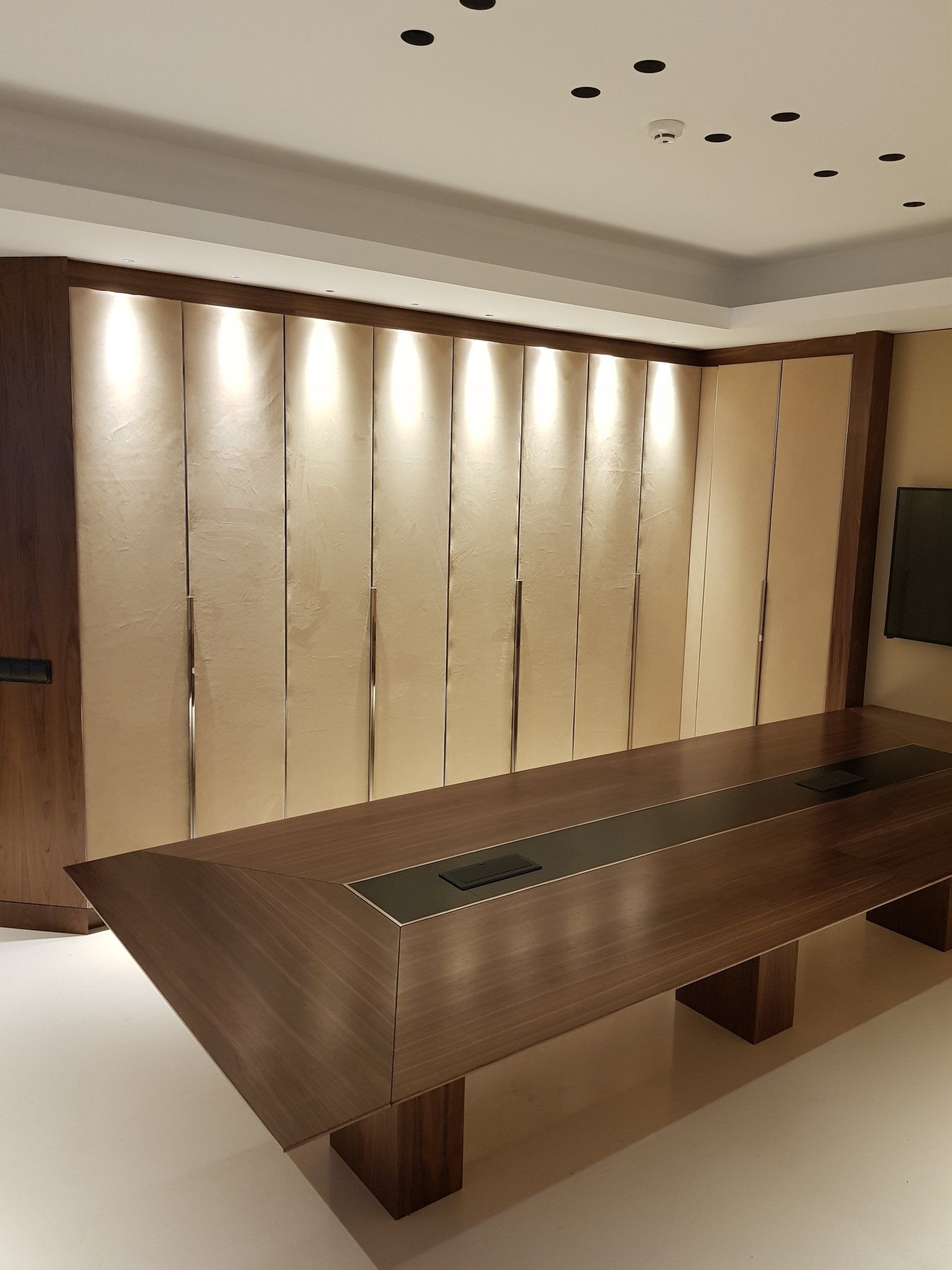 Trabajos realizados en oficinas centrales de Gilmar, fabricando frentes de armario tapizados con tiradores en acero inox, mesa en nogal americano con zona central preparada para electrifica